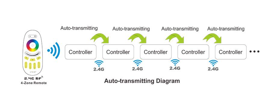 This strip controller can transmit the signal between each other within 30 m, as long as there is a strip controller within 30 m, the remote control distance can be limitless