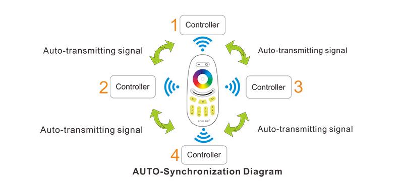 Different controllers can work synchronously when they are strarted at different times, controlled by the same remote,controller will be auto-synchronizing in the same brightness, same color temperature turn on, turn off at the same time within 30m controlling distance. (except the“Mode 5")