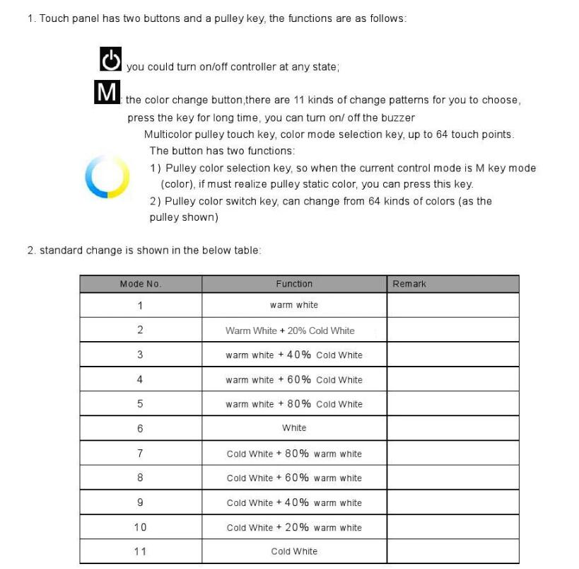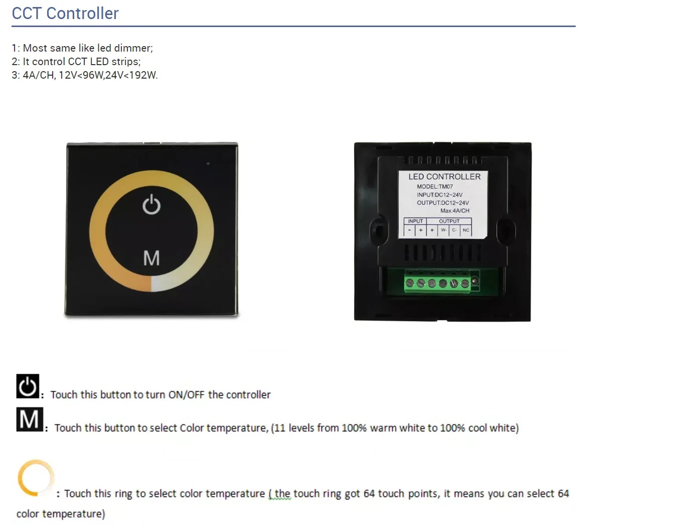 This Touch panel Color temperature controller is a new high-end controller newly designed by our factory. The glass panel design, makes the appearance more beautiful and fashionable. It adopts high precision capacitance touch control chip, increases the touch sensitivity, and can reduces trigger which caused by mistake. It is used for controlling a variety of lamp whose source of light is LED. For instance, point source of light,flexible light strip, wall washer lamp, glass curtain wall light etc., it has many advantages such as convenient to connect, easy to use ,etc. It can realize cold,white warm white,pure white light Color-temperature and other effects of lighting change.