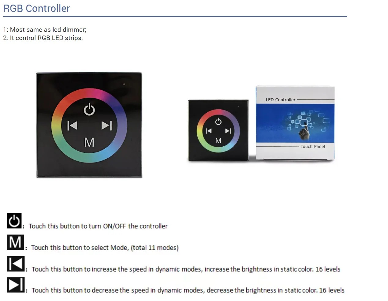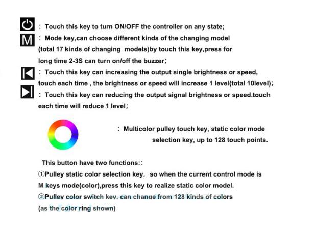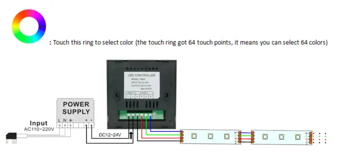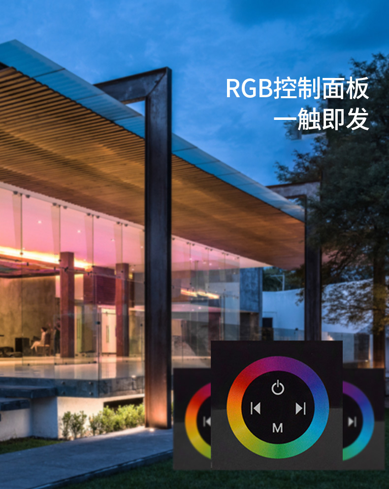 RGB Touch panel controller is a new high-end controller which newly developed by our company. It adopts glass panel design, is beautiful and fashionable in appearance. It adopts high precision capacitance touch control chip, increases the touch sensitivity, reduces trigger which caused by mistake. It is used for controlling a variety of lamp whose source of light is LED. For instance, point source of light,flexible light strip, wall washer lamp, panel lights etc., it has many advantages such as convenient to connect, easy to use and others. According to the actual need of customers,it can carry out jumpy changing,gradual changing, strobo flash and other effects of change.