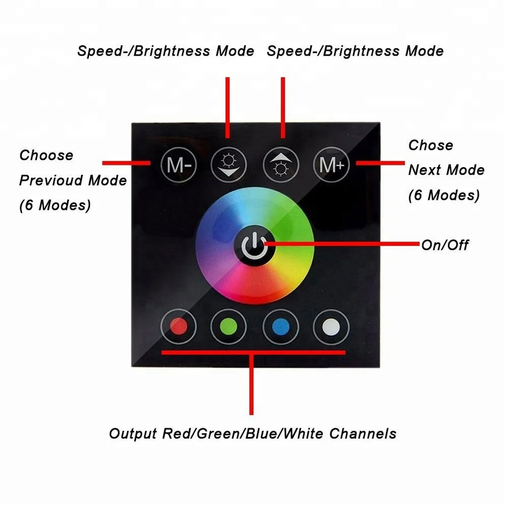 RGBW Touch Panel is a new upmarket controller which is newly developed by our factory. It adopts glass panel design, is beautiful and fashionable in appearance. It adopts high precision capacitance touch control chip,increases the touch sensitivity, reduces wrong trigger which caused by mistake. It is used for controlling a variety of lamp whose source of light is LED. For instance, point source of light,flexible light strip, wall washer lamp, glass curtain wall light etc., it has many advantages such as convenient to connect, easy to use ,etc. It can realize jump change, gradually change, strobe and other effects based on application requirement.