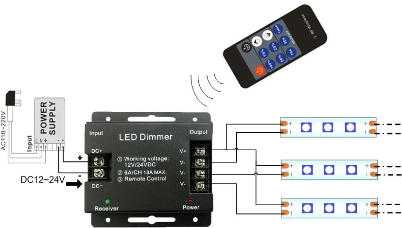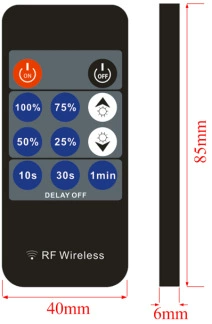This Iron shell RF 11 Keys Single color led dimmer adopt the RF wireless remote control,can adjust brightness infinitely to change the brightness. User could adjust the light to the appropriate lighting brightness in accordance with the 25%,50%,75%,100% brightness hot keys easily..what’s more, its with the 10 Seconds/30 second/1 minute delay off function,this can realize more humanized to used.