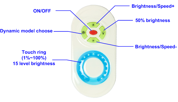 2.Adopt wireless 433.9mhz RF Touch 5 keys remote control, its function as follows: