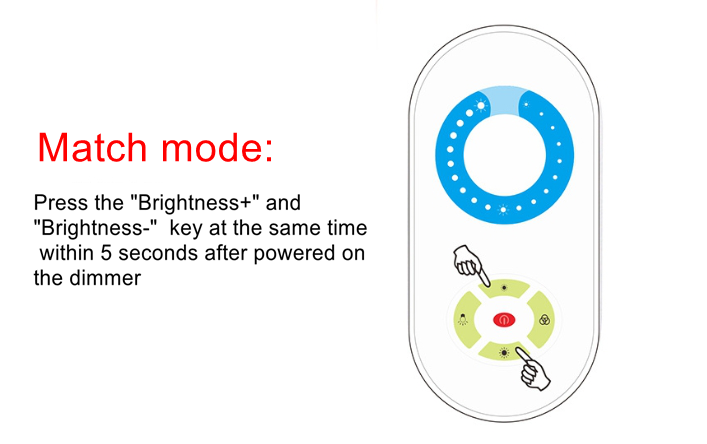 - if the user want to match code again, then just need to press the “brightness+”and “brightness-”key at the same time within 5 seconds after powered on the dimmer.