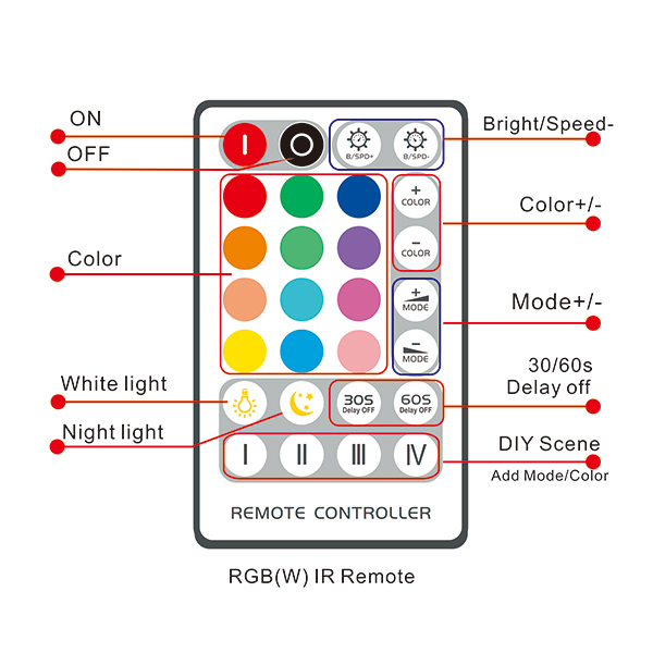 Tuya Wifi 28 keys RGB(W) led controller is a intelligent LED controller which is compatible with mobile phone control, voice control and IR remote control. It use Tuya wifi solution technology to ensure device’s stability in LAN control and remote control. Main function are 16 million colors adjustment, dynamic modes, brightness adjustment, speed adjustment, DIY modes, Timing function, Music control etc.