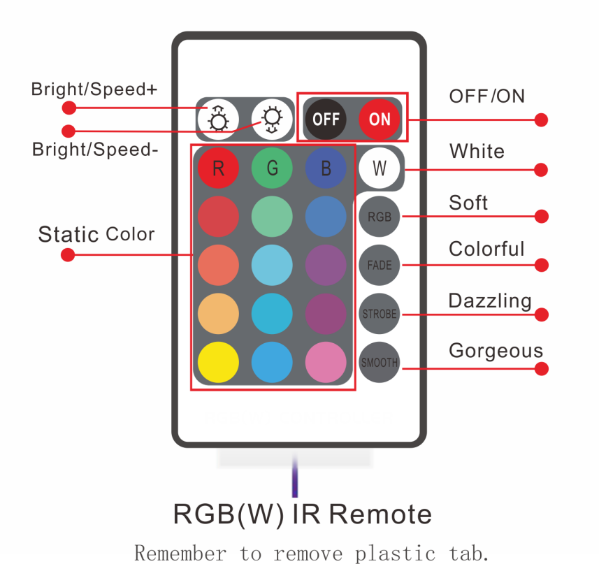 Tuya WiFi IR 24-keys RGB controller is a intelligent LED controller which is compatible with mobile phone control, voice control and IR remote control. It use Tuya wifi solution technology to ensure device’s stability in LAN control and remote control. Main function are music control modes, 16 million colors adjustment, dynamic modes, brightness adjustment, speed adjustment, DIY modes, Timing function etc.